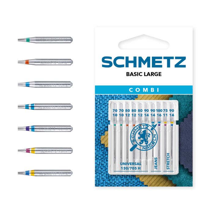 Schmetz Basic Large Combi-Box, packet of 10 Needles containing: 6x Universal Needles, 2x Jeans Needles, 2x Stretch Needles.